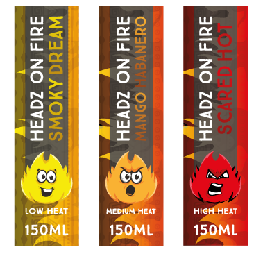 During my work at Sticker Gizmo, I was tasked with re-designing the product labels for Headzonfire hot sauce. The client specifically requested that the artwork clearly convey the heat levels of each sauce, so I opted to create character illustrations that utilize distinct colours and facial expressions to represent varying heat intensities.